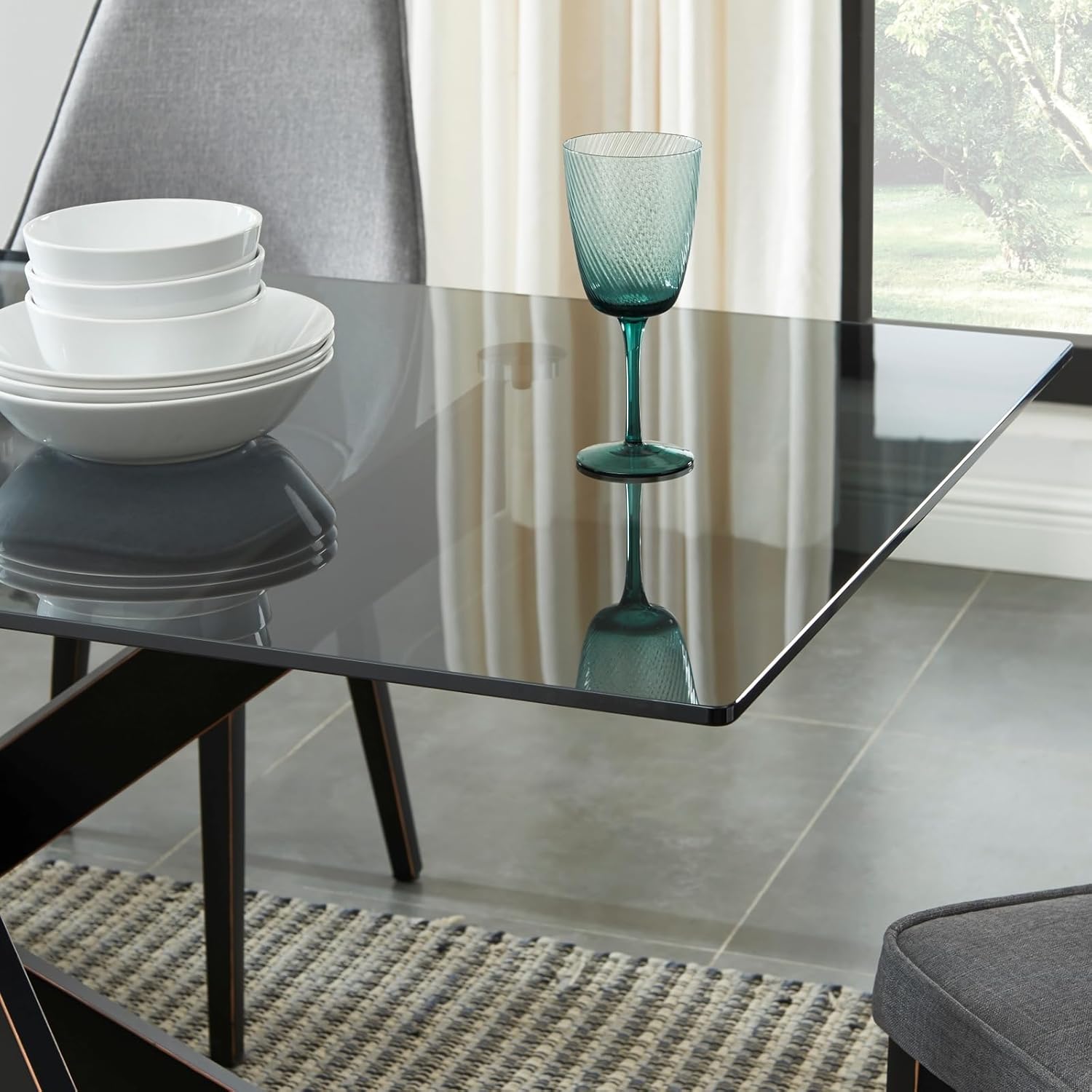 Modern Style Dining Table with Gray Tempered Glass Top and Black Metal Tubular Legs, 58.5”Lx29”Wx30”H